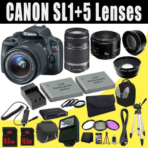 Canon EOS Rebel SL1 18.0 MP CMOS Digital SLR with 18-55mm EF-S IS STM + EF-S 55-250mm f/4.0-5.6 IS Telephoto Zoom + EF 50mm f/1.8 II SL1 Lens + LP-E12 Replacement Lithium Ion Battery + External Rapid Charger + 8GB+16GB SDHC Class 10 Memory Card + 58mm Wide Angle Lens + 58mm 2x Telephoto Lens + 58mm 3 Piece Filter Kit + 58mm Macro Close Up Kit + Mini HDMI Cable + Carrying Case + Backpack + Full Size Tripod + External Flash + Multi Card USB Reader + Memory Card Wallet + Deluxe Starter Kit Bundle Details :