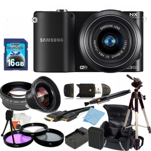 Samsung NX1000 Mirrorless Wi-Fi Digital Camera with 20-50mm Lens (Black) Kit. Includes 0.45X Wide Angle Lens, 2X Telephoto Lens, 3 Piece Filter Kit (UV-CPL-FLD), 16GB Memory Card, Card Reader, Extedned Life Replacement Battery + Charger, Tripod, Case & More Details :